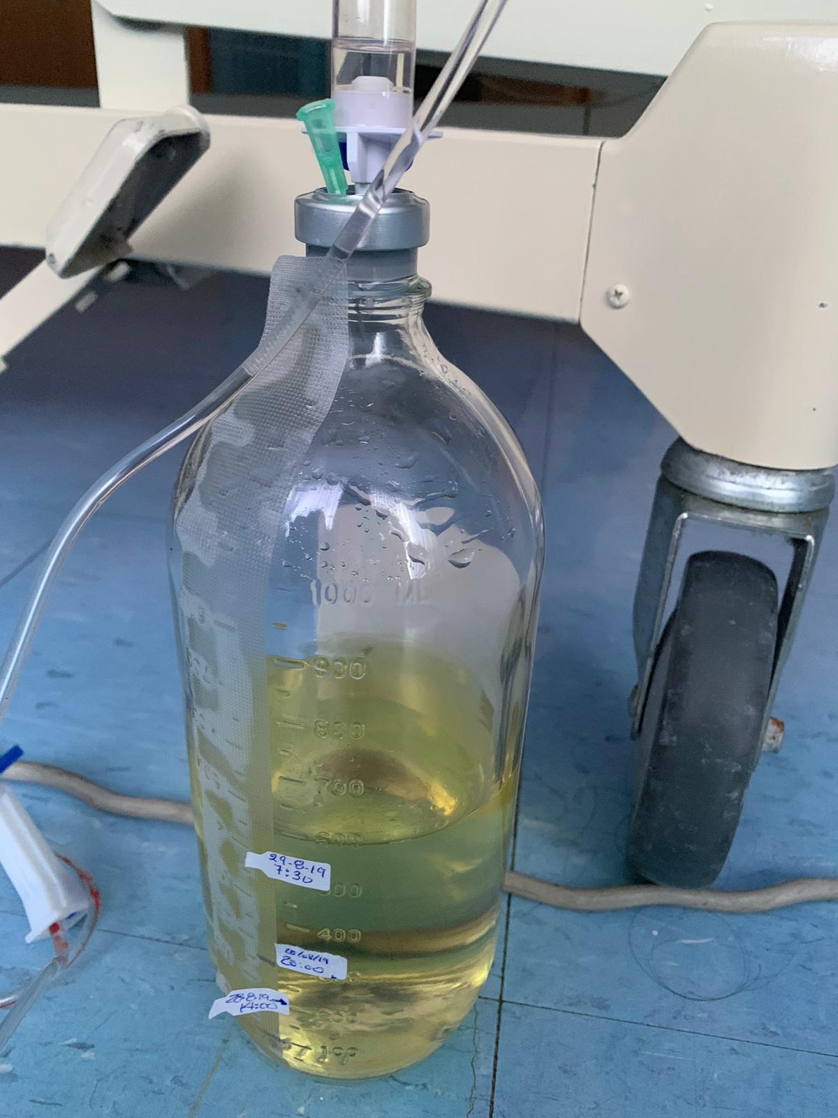 Me explicó el doctor: "Algunas veces se llega a fistular el parche, en esos casos el procedimiento es drenar el líquido de la columna hacia afuera, para que selle el parche y cierre la fístula". Así lo hicieron: el 28 de agosto me realizaron una punción lumbar. La cual consistió en introducir una aguja, a la altura media de la columna, que va a la médula espinal y de ahí drenan el líquido a una botella. Este procedimiento fue una de las cosas más dolorosas que viví en el hospital, porque se hace sin anestesia y podía sentir cómo iban metiendo la aguja, misma que dejan adentro durante todo el procedimiento, así que tenía prohibido moverme, pararme, ir al baño e incluso toser o pujar, ya que se podría mover la aguja y provocarme un daño irreversible en la columna, además de tocar terminaciones nerviosas. Entonces, además de todo lo que tenía ya conectado a mi cuerpo, me pusieron de nueva cuenta la sonda de la orina, que me habían retirado cuando me bajaron a piso.